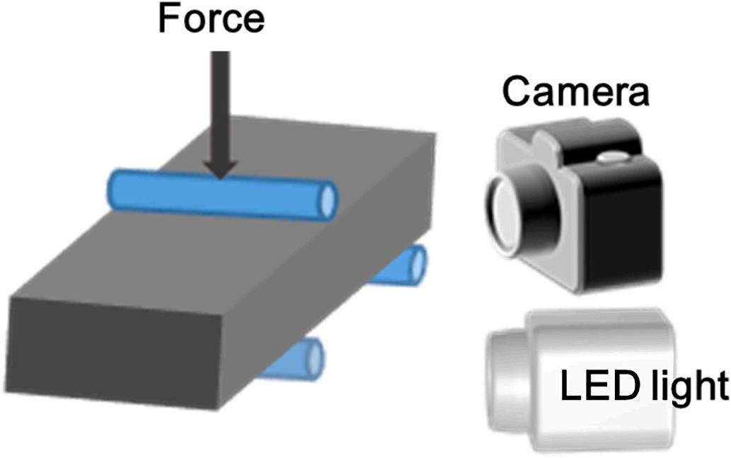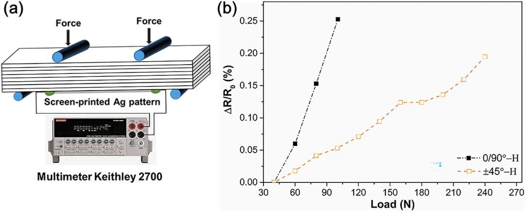 图10:(a)四点弯曲试验示意图,(b)相对电阻变化率作为负载的函数。
