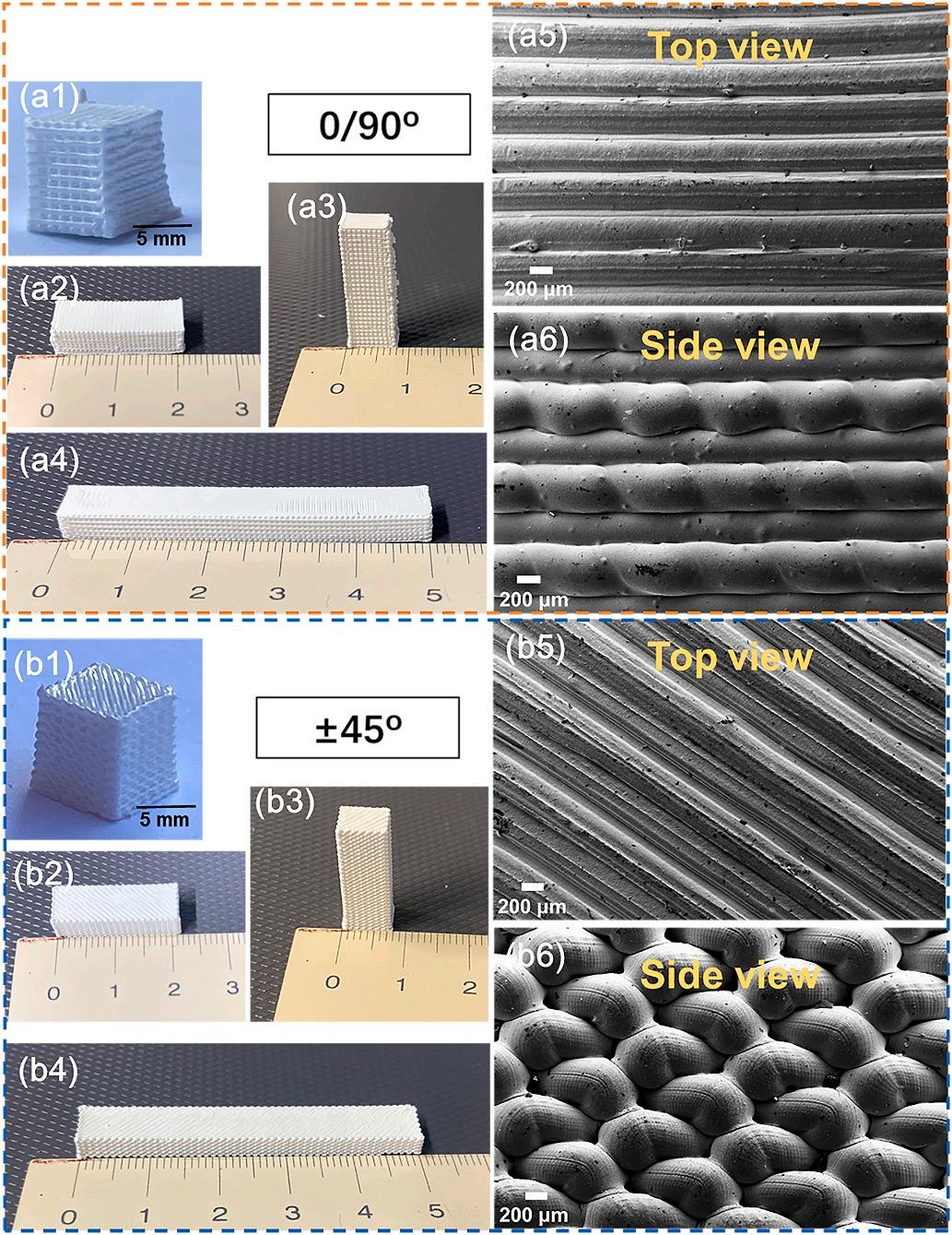 烧结样品的光学图像以及具有不同细丝取向的DIW基氧化锆样品的顶视图和侧视图:(a1-a6) 0/90°,和 (b1-b6) ±45°。