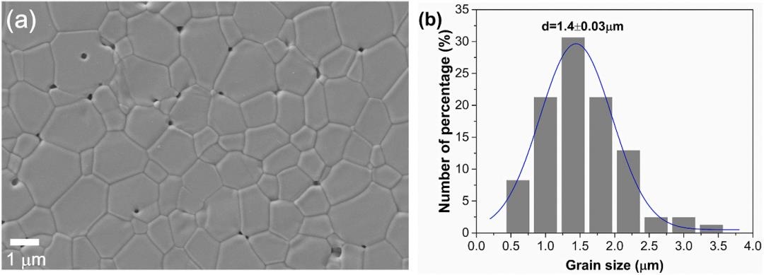 图5:(a)烧结氧化锆样品的FESEM显微照片,丝状取向为±45°,(b)从FESEM图像获得的晶粒尺寸分布。