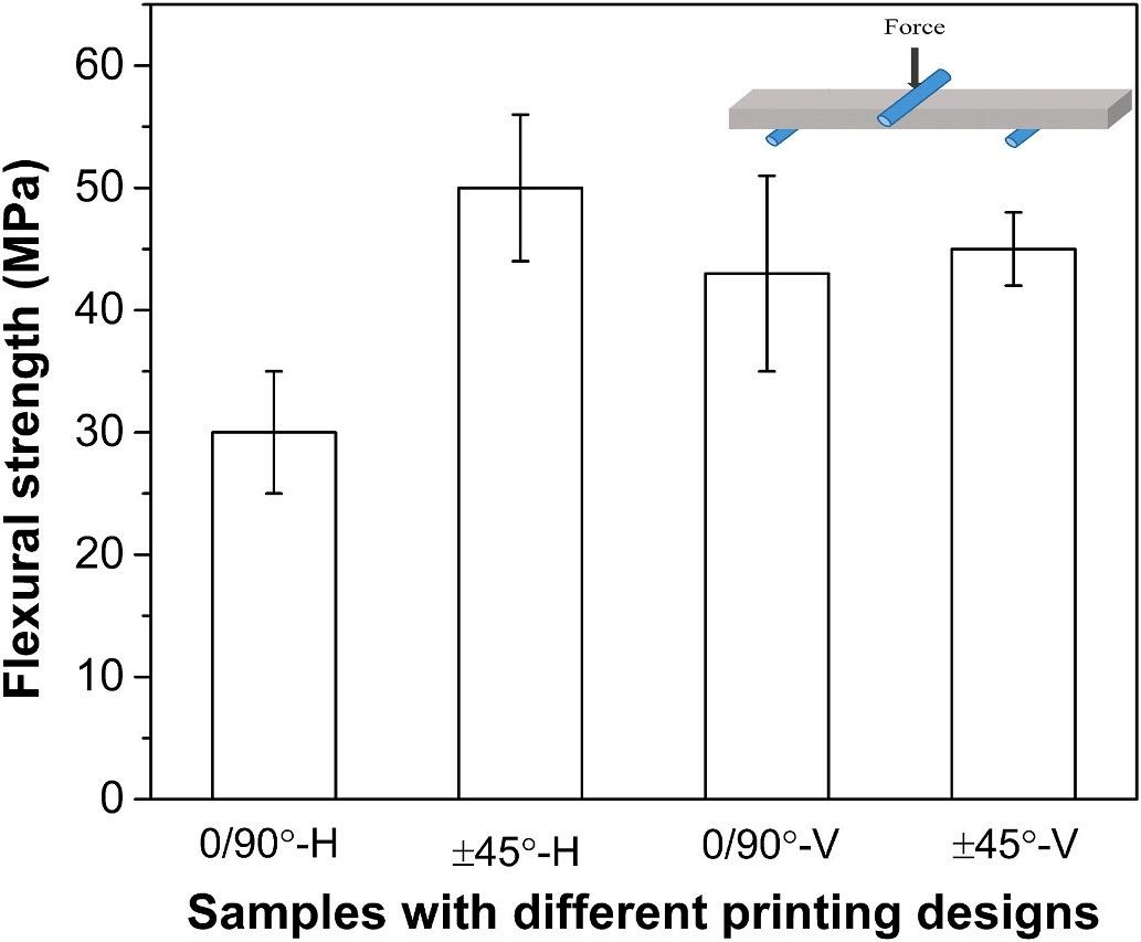 打印方向(水平或垂直)和细丝方向(0/90°和±45°)显著影响抗弯强度,其中水平打印方向和±45°细丝方向的样品抗弯强度最高(50 MPa)。