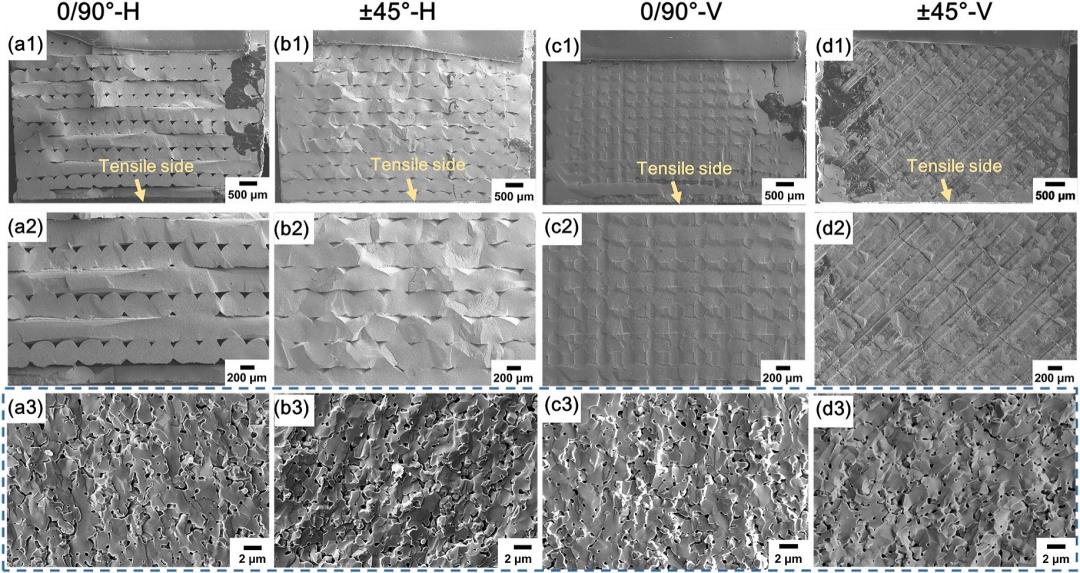 断裂表面分析显示,烧结后与打印设计相关的缺陷是关键故障位置,尤其在水平打印样品中,孔隙率较高且层间结合不良。