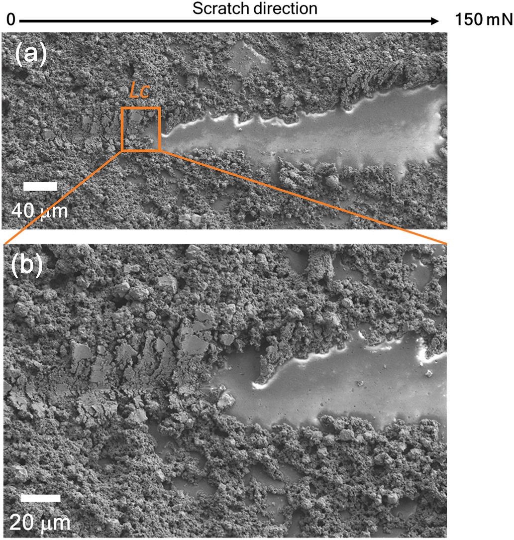 通过划痕测试评估了丝网印刷银图案与氧化锆基底之间的附着力。临界负载(Lc)约为25 N,表明银涂层与基底之间具有良好的结合强度。FESEM观察显示,在临界负载下,银涂层开始出现裂纹和剥落现象。