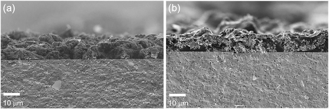 图11:附有银涂层的断裂氧化锆样品的横截面FESEM图像:(a)0/90°细丝取向,(b)±45°细丝取向。