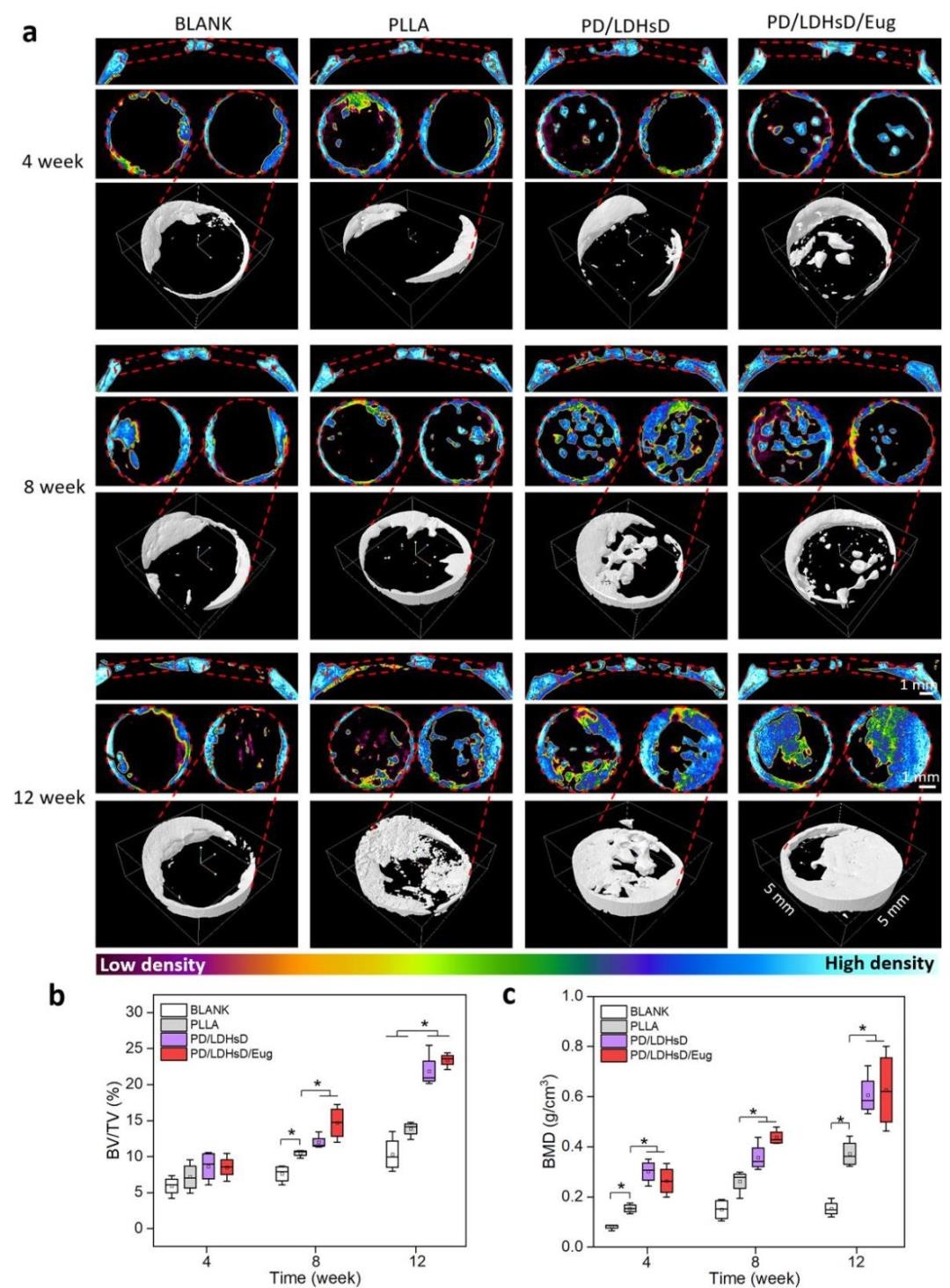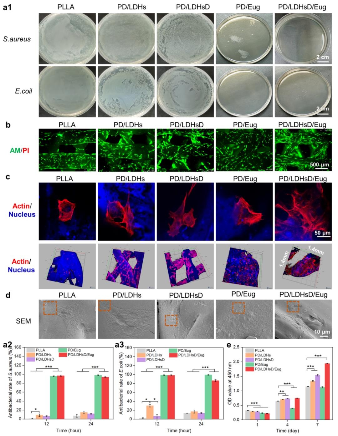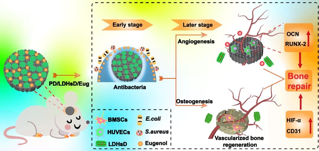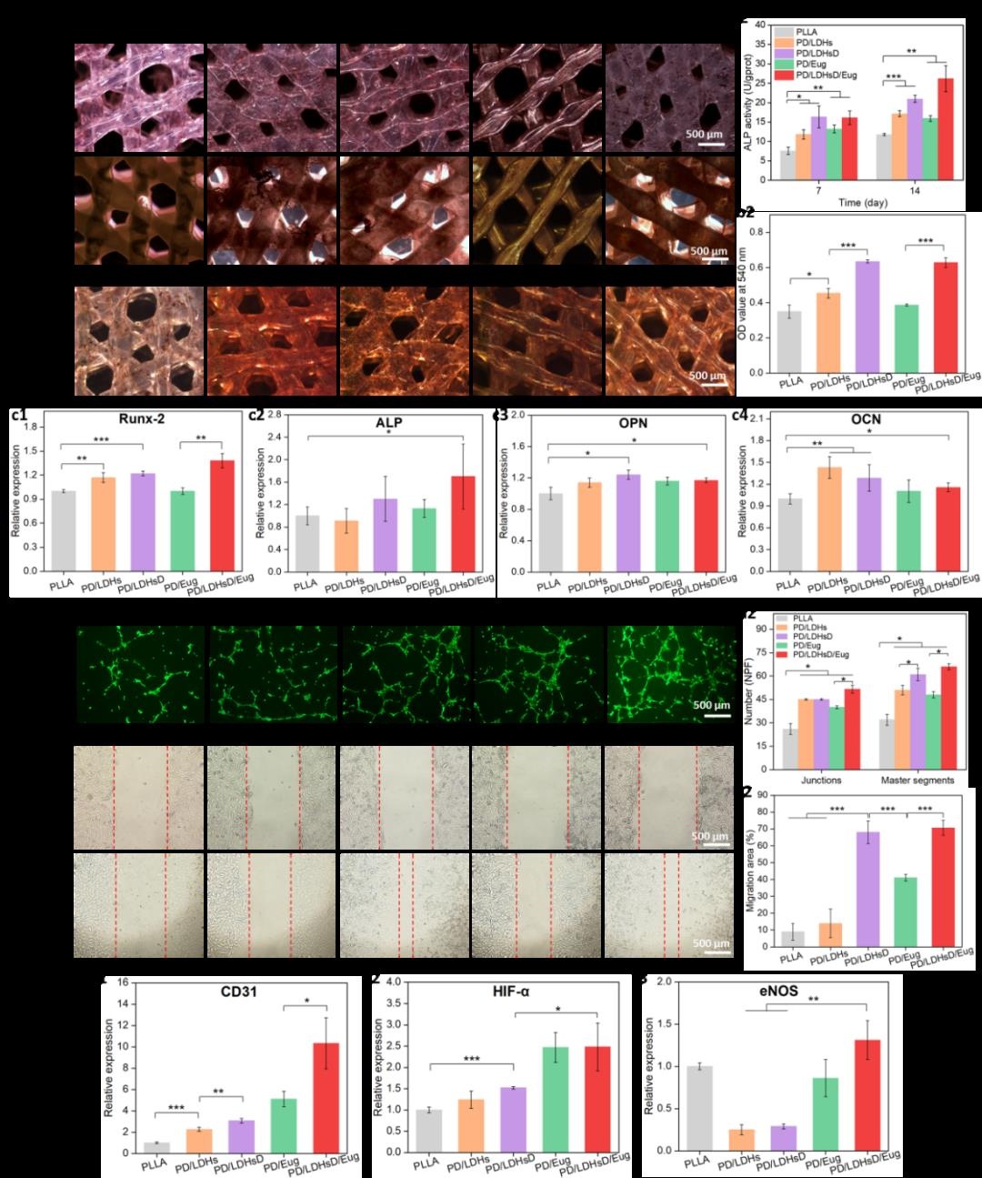 该团队通过聚多巴胺(PDA)成功地将天然抗菌剂—丁香酚和载有成血管的二甲基草酰甘氨酸(DMOG)的层状双氢氧化物(LDHs)加载到3D打印的PLLA支架表面。由于丁香酚的早期释放,支架最初表现出很强的抗菌作用,而LDH持续释放的DMOG在后期提供了促进长期的成骨和血管生成的能力。