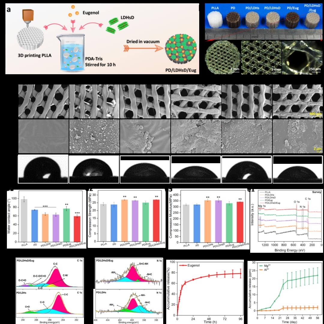 在这一研究中,该团队利用PDA将负载DMOG的LDHs(LDHsD)和丁香酚(Eug)同步修饰到3D打印的PLLA支架表面。由于PDA与LDH含有丰富的氨基和羟基,因此修饰后的复合支架亲水性增强。