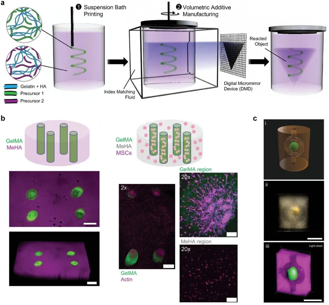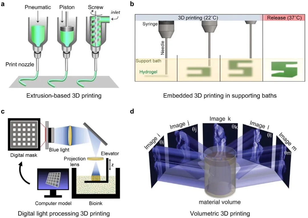 体积3D打印:通过光学层析投影同时产生整个3D对象,具有快速打印和无需支撑结构等优势,但需要透明、大量生物墨水,限制了其在高成本材料或大型结构制造中的应用。