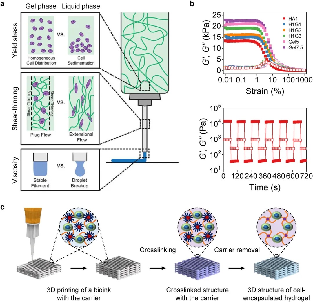 嵌入式3D打印:在支撑浴中则将生物墨水打印到屈服应力介质中,该介质在打印过程中临时支撑结构,直到后处理交联,降低了对生物墨水流变性能的要求。