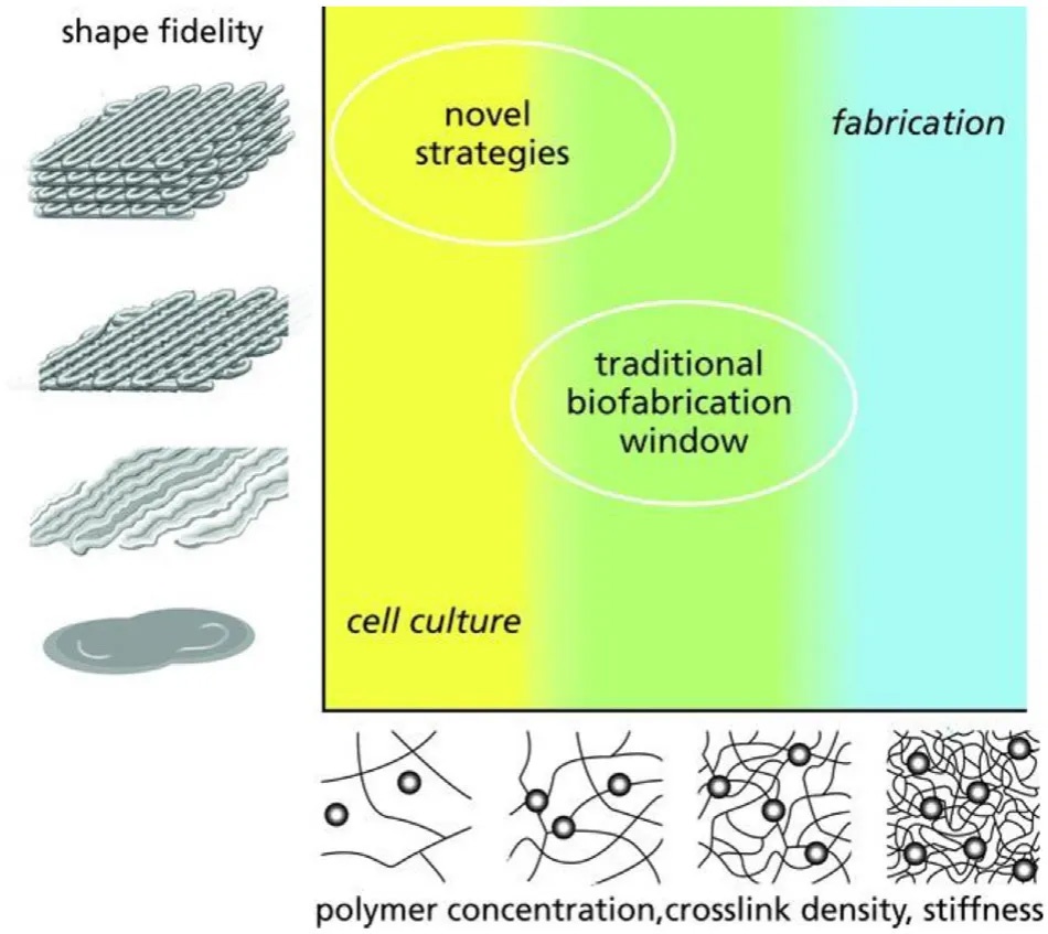 “生物制造窗口”的概念强调了在生物3D打印中,生物墨水的流变特性需要在3D可打印性和细胞兼容性之间找到一个平衡点。为了实现3D打印,生物墨水必须具有足够的粘度和结构稳定性,以形成连续的丝状结构并保持其形状的完整性。然而,为了确保细胞的活性和功能,生物墨水还需要为细胞提供一个适宜的生长环境,避免因过高的粘度或聚合物密度而限制细胞的增殖和代谢。这两个相互矛盾的要求之间的平衡点被称为“生物制造窗口”,它是实现高保真度打印和细胞活性的关键。