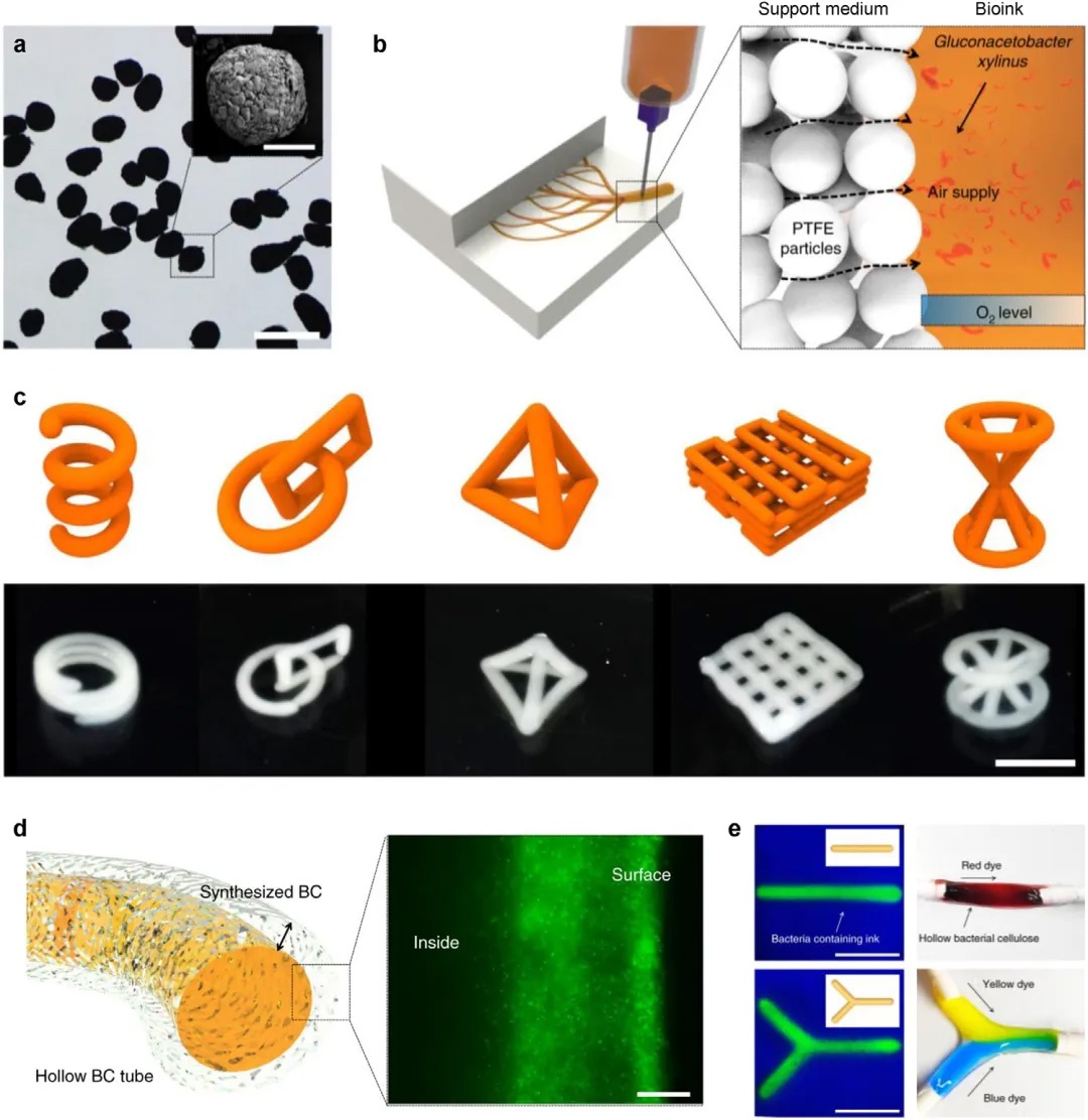 在支撑浴中嵌入式3D打印技术用于制造工程化活体材料(ELMs)的过程如图1所示。图中展示了用于支撑浴的聚四氟乙烯(PTFE)微粒,这些微粒具有空气透过性,支持氧气依赖的细胞生长。通过嵌入式3D打印技术,利用空气透过性微粒基质作为支撑介质,可以制造出复杂的细菌纤维素(BC)结构。