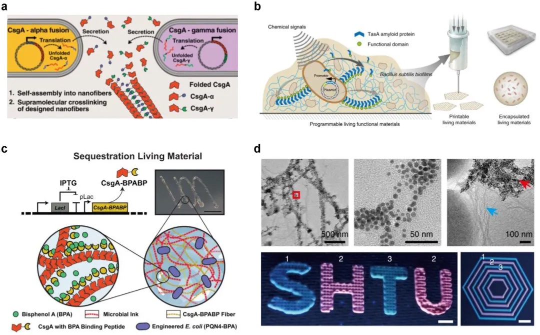作者展示了合成生物学在生物3D打印工程化活体材料(ELMs)中的应用。图中展示了通过基因工程改造的微生物细胞分泌的CsgA融合蛋白和TasA淀粉样蛋白融合蛋白,这些蛋白可以自组装成具有剪切变稀特性的纤维网络,形成适合3D打印的生物墨水。