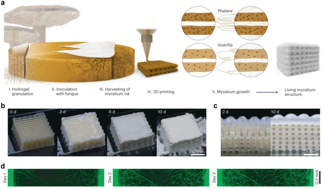 图8展示了3D打印的活体菌丝结构在打印后通过菌丝生长进行结构演化和功能增强的过程。展示了菌丝在打印结构中的生长过程,以及菌丝在结构受损后的自愈能力。随着时间的推移,菌丝在结构内部生长,填充空隙并增强结构的机械性能。