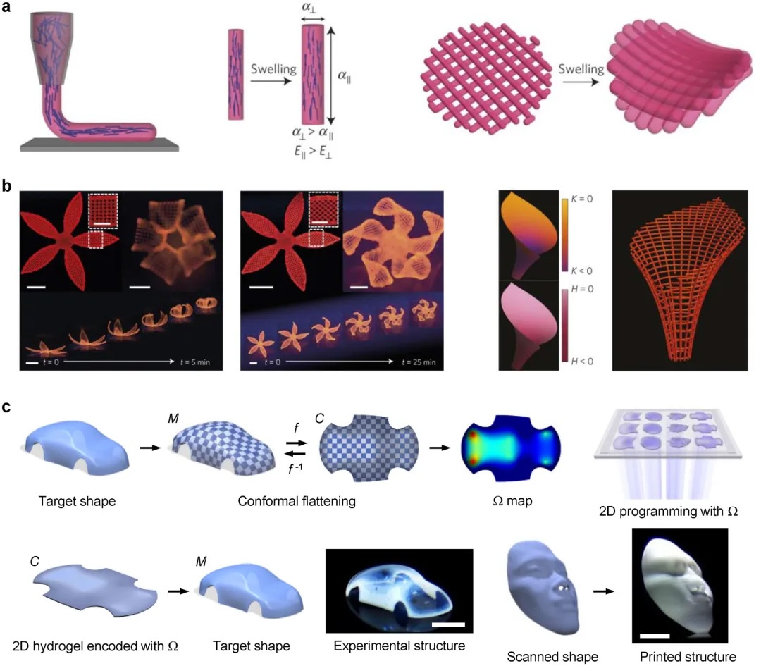 4D打印技术,即利用形状记忆材料或刺激响应性材料制造能够在特定刺激下改变形状的结构。图中展示了两种4D打印方法:生物模拟4D打印和数字光4D打印。生物模拟4D打印通过挤出式3D打印制造双层水凝胶结构,利用各向异性的膨胀实现形状转换。数字光4D打印则通过数字光投影技术将3D目标形状转换为2D平面,然后通过光刻技术实现形状转换。
