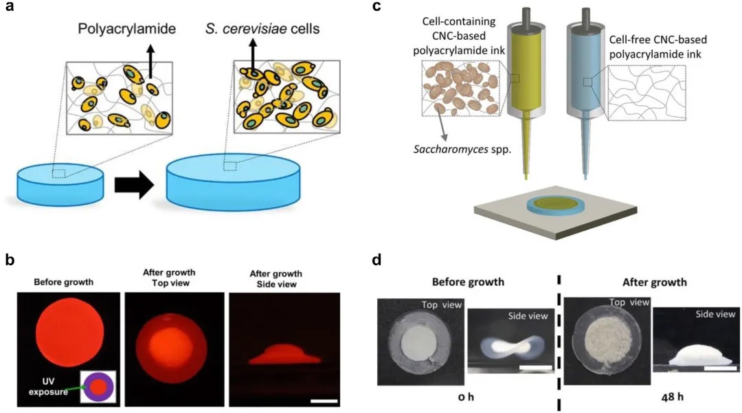 作者展示了将形状变形材料与工程化活体材料(ELMs)的生物3D打印相结合的概念。图中展示了由酵母细胞增殖引起的ELM体积膨胀,以及通过空间控制细胞增殖实现的形状变形。通过使用图案化的紫外线(UV)光照射,可以选择性地杀死细胞,从而在ELM中形成特定的生长区域,实现从平坦结构到类似帽子的形状变形。