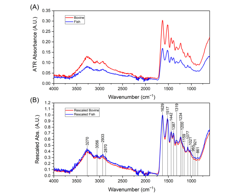 两种胶原肽的FTIR光谱无显著化学结构差异,主要吸收峰位置一致:3250 cm⁻¹、1500–1600 cm⁻¹、500 cm⁻¹,符合胶原蛋白特征吸收区间(700–1700 cm⁻¹、2800–3500 cm⁻¹)。通过二阶导数分析定位的吸收峰,可归属为多肽特征化学键振动(见表1),仅部分峰的相对强度存在微小差异(归因于氨基酸组成差异)。