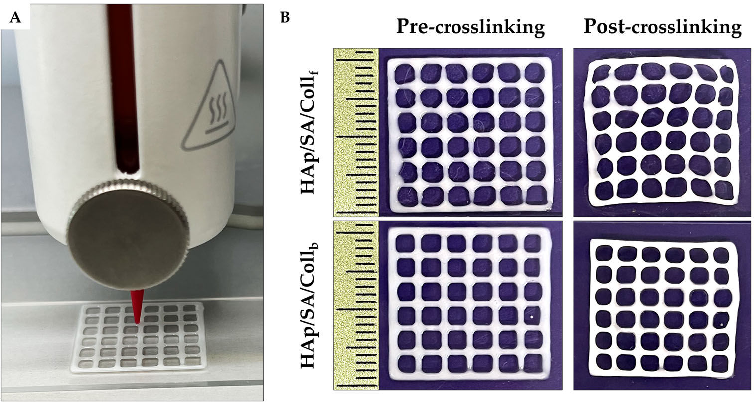 图4 (A)HAp/SA/Coll基墨水打印20×20×0.6 mm³方格的过程;(B)两种墨水打印方格在交联前后的可打印性评估