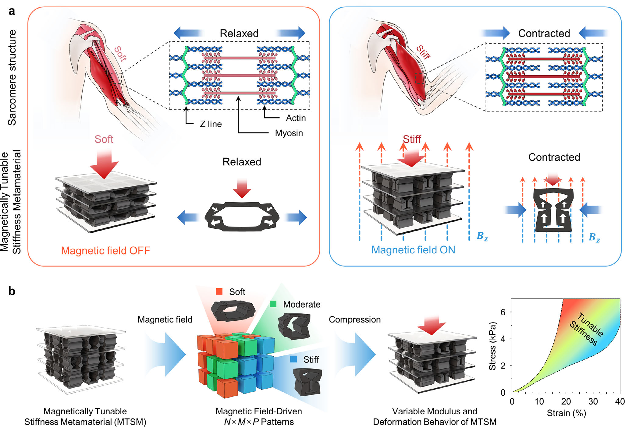 MTSM 设计灵感与三态编程概念。 a) 肌节松弛/收缩与超材料软/硬对应; b) 通过磁场方向实现单元三态组合,获得可编程三维刚度分布。
