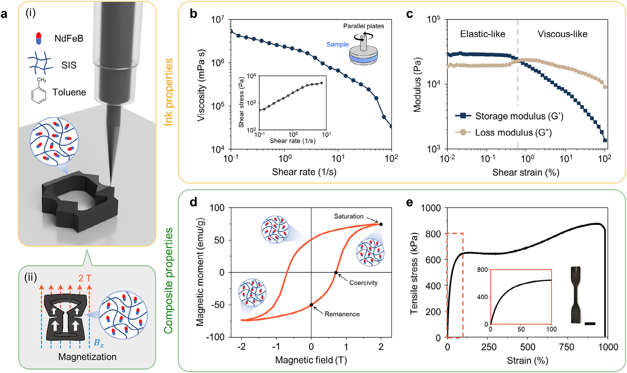 4D 打印磁活性材料。 a) 打印-充磁两步工艺; b) 墨水剪切变稀; c) 储能与损耗模量; d) 剩磁 50 emu g⁻¹、矫顽力 700 mT; e) 拉伸模量 ≈400 kPa,断裂伸长>900 %。