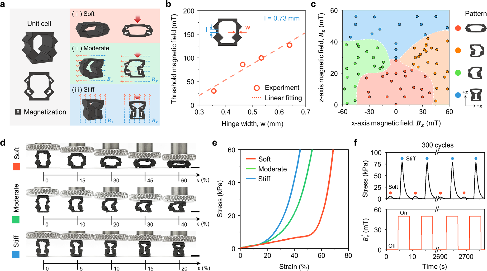 单单元三态压缩行为。 a) 三态示意; b) 铰链厚度与临界磁场关系; c) 磁场方向-状态相图; d) 实验变形序列; e) 对应应力-应变曲线; f) 300 周期循环稳定性。