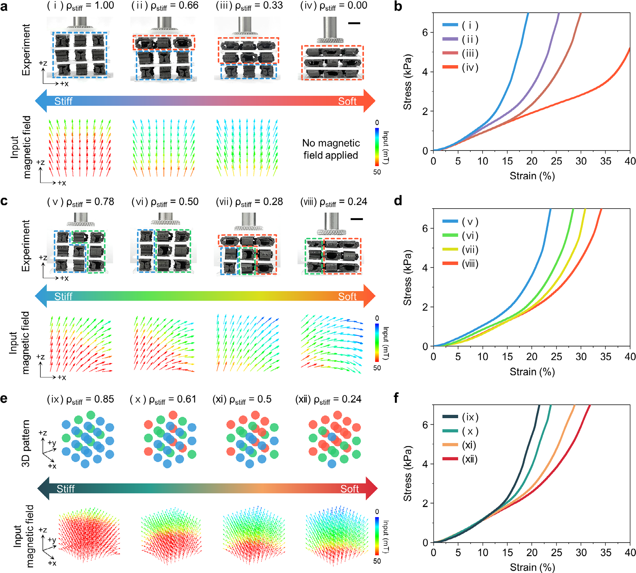 3×3×3 阵列。 a)-b) 沿 z 轴梯度场实现层状刚度组合; c)-d) 沿 x 轴引入中态; e)-f) 三轴磁场协同控制 27 单元任意刚度分布。