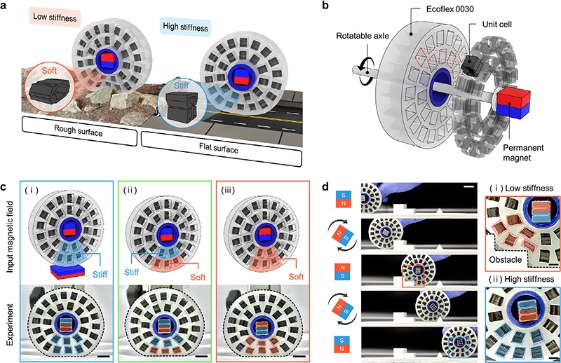 MTSM 刚度可调车轮。 a) 概念:软态越障、硬态稳行; b) 爆炸视图; c) 三态变形对比(0.88 N 载荷); d) 连续越障实验,N/S 极切换实现软/硬实时转换。