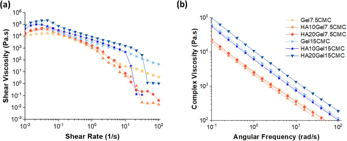流变测试结果表明,所有水凝胶墨水均表现出明显的剪切稀化行为,有利于挤出式3D打印过程。随着明胶和HA浓度的增加,水凝胶的粘度和储能模量显著提高,凝胶温度也随之升高。