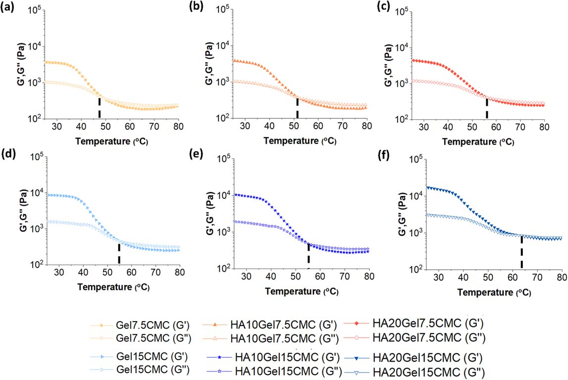 温度扫描结果显示,随着HA含量的增加,凝胶温度升高。例如,7.5%明胶组中,凝胶温度从48.5°C(无HA)升高至56°C(20%HA);15%明胶组中,凝胶温度从54°C(无HA)升高至63°C(20%HA)。