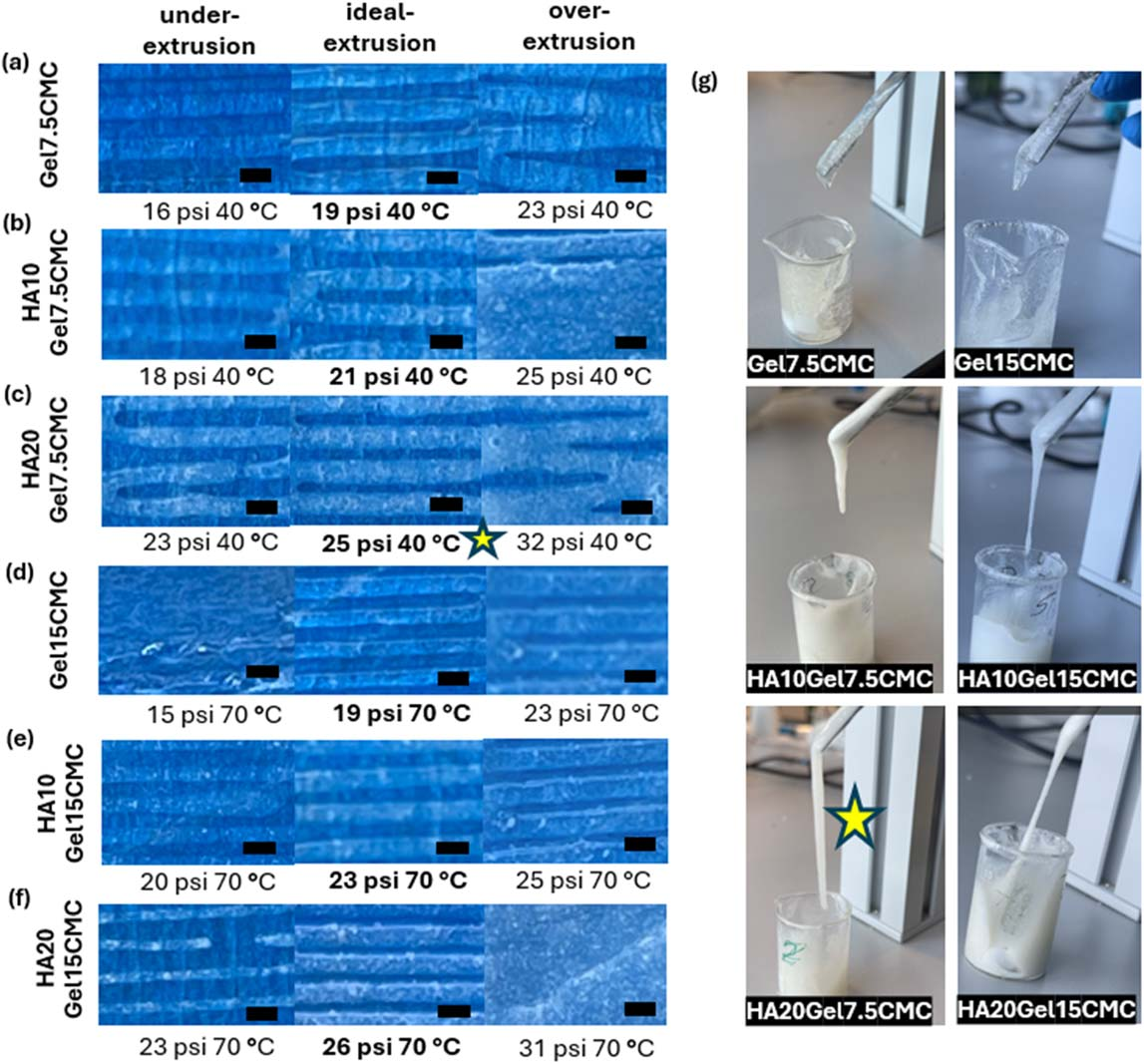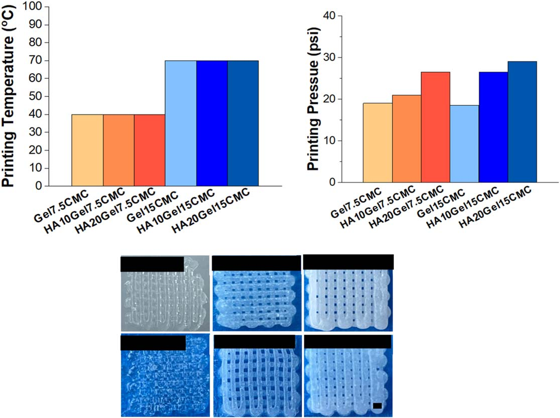 打印适性测试表明,高浓度明胶(15%)配方需要更高的打印温度(70°C)和压力,可能不适合细胞负载的生物打印应用。相比之下,7.5%明胶配方在较低温度(40°C)下即可实现良好的打印表现,更适合生物打印。