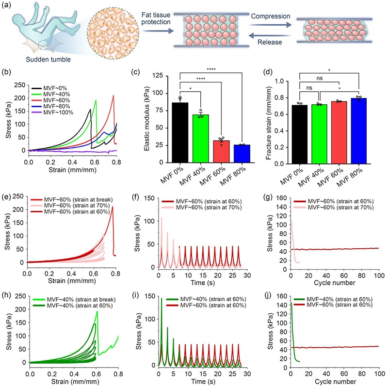 研究人员制备了不同微凝胶比例(40%、60%、80%、100%)的GC水凝胶,并对其进行压缩测试。结果表明,随着微凝胶比例的增加,GC水凝胶的弹性模量逐渐降低,但断裂应变无显著变化。值得注意的是,含60%微凝胶的GC水凝胶在60%应变下表现出优异的循环压缩性能,100次循环后峰值应力变化极小。