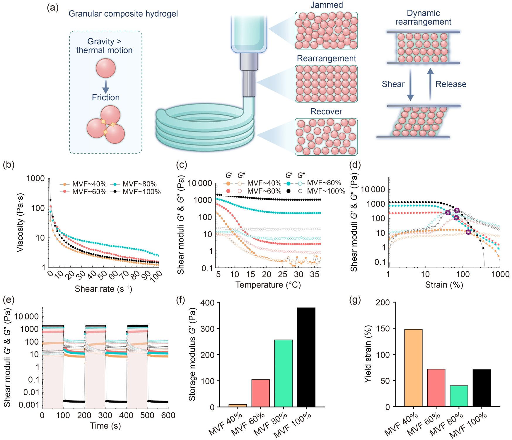 近年来,颗粒水凝胶因其独特的机械和流变特性受到关注。这类水凝胶通过物理/化学交联稳定,表现出静止时类似固体、剪切应力下类似流体的行为,适用于生物打印和细胞培养支架。然而,微凝胶间较弱的相互作用限制了其结构完整性。受人体脂肪组织双相组成的启发,本研究团队开发了颗粒复合(GC)水凝胶,将微凝胶作为分散相(D相),次级水凝胶前体作为间隙基质(M相),在增强机械稳定性的同时保持注射性和可打印性。