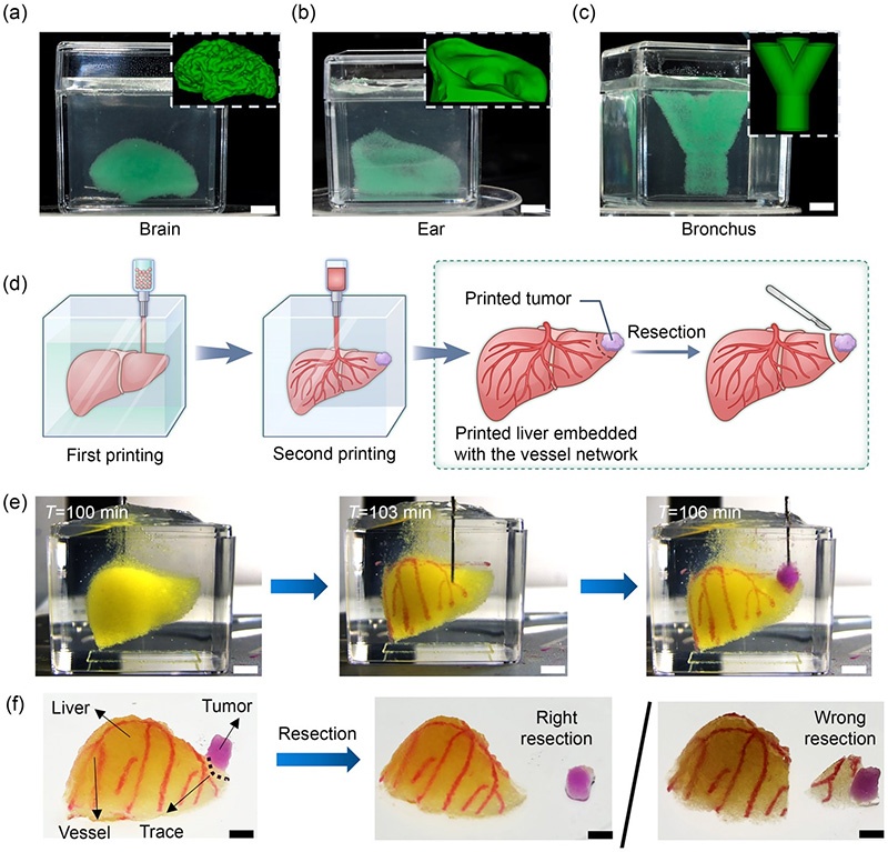 图5:使用GC水凝胶打印的脑、耳、支气管模型及用于术前规划的肝脏模型(含血管网络和肿瘤)