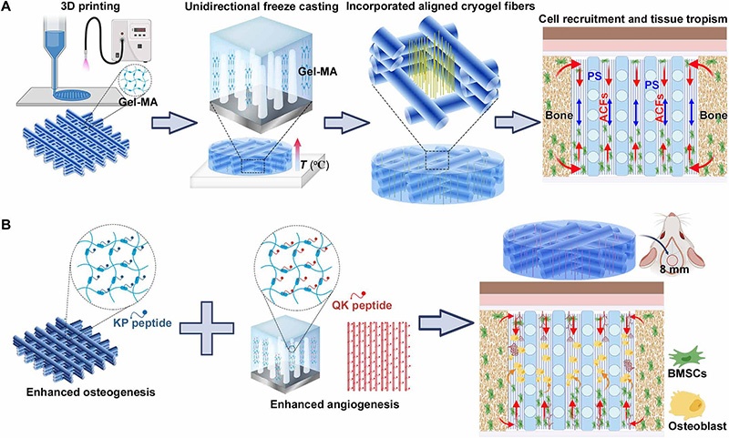 研究提出“结构引导-功能调控”双策略,设计并制备含垂直定向冷冻凝胶纤维(ACFs)且经QK肽(促血管)与KP肽(促成骨)修饰的复合3D打印支架(PS-KP500/ACFs-QK500),制造流程如下: