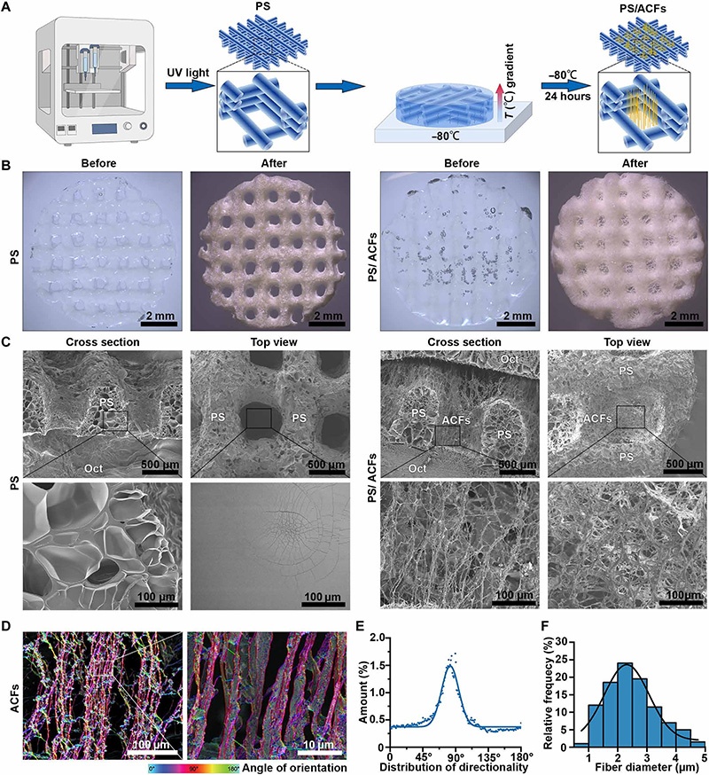 A:通过3D打印结合冷冻铸造制备ACFs复合3D打印支架的流程示意图(UV为紫外光);
