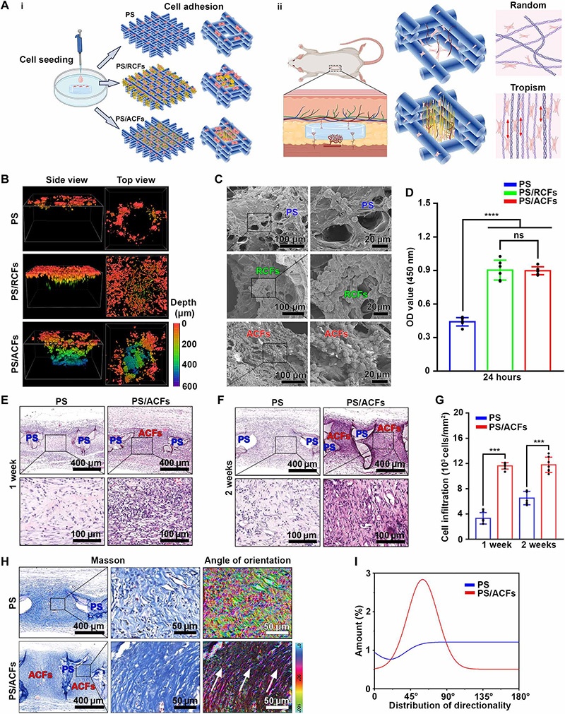 A:(i)PS、PS/RCFs、PS/ACFs的体外细胞接种与黏附示意图;(ii)大鼠皮下植入模型评估PS/ACFs的体内细胞募集与组织长入示意图;