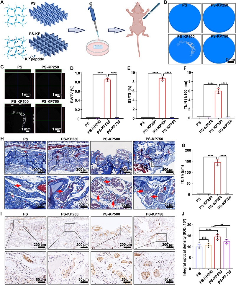 B:Micro-CT 3D重建图(4周):PS-KP500组(500μg/ml KP肽)可见明显新生骨,PS、PS-KP250(250μg/ml)、PS-KP750(750μg/ml)组几乎无新生骨;