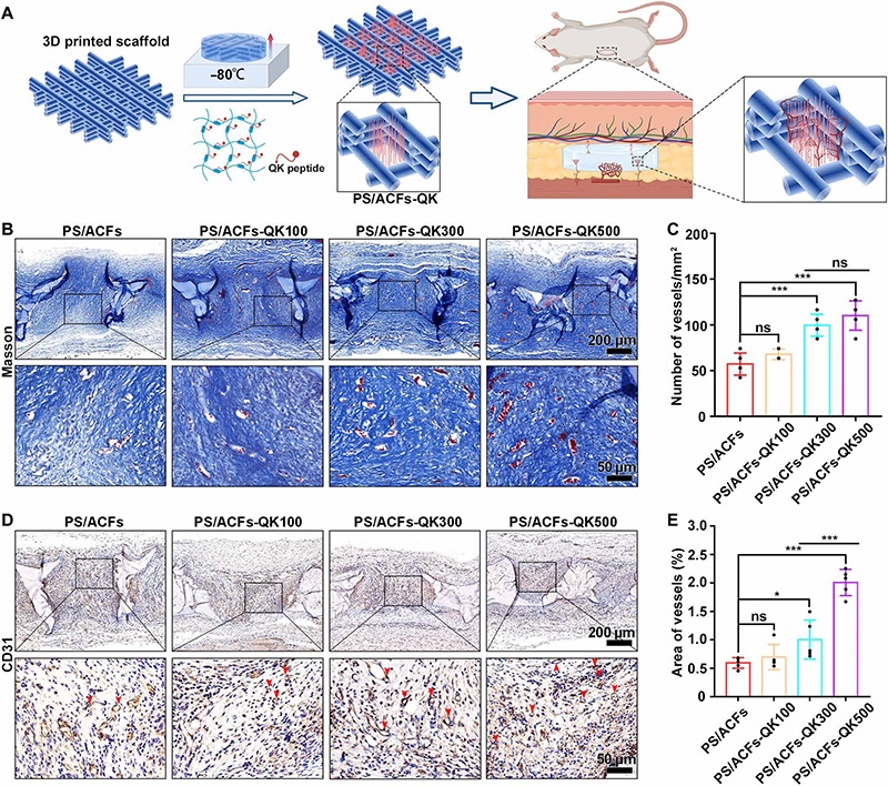 D-E:CD31免疫组化染色与血管面积定量:PS/ACFs-QK300(300μg/ml)与QK500组新生血管面积高于PS与QK100组,且QK500组高于QK300组;