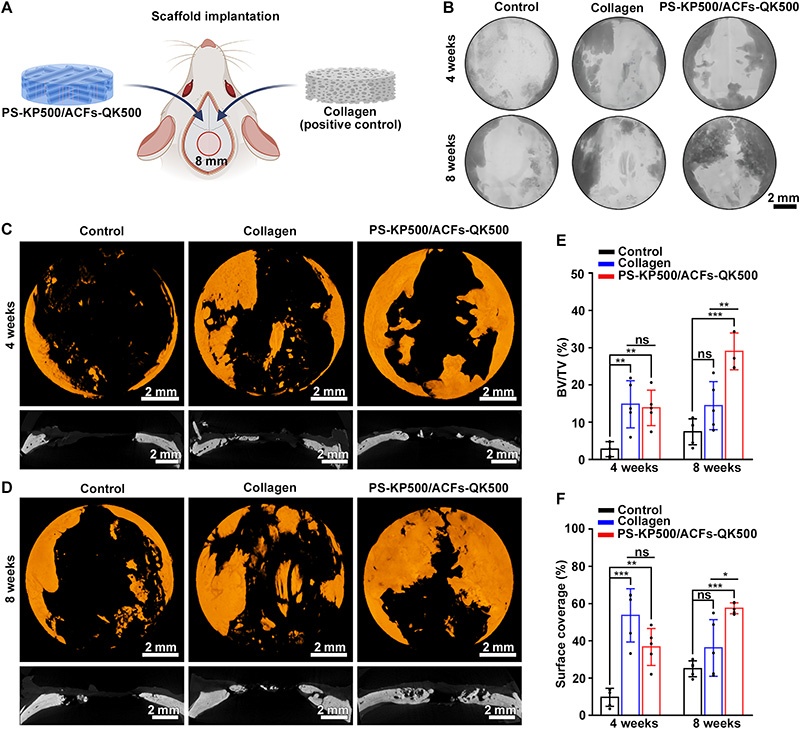 E-F:定量分析(4、8周):4周时两组骨体积分数(BV/TV)与表面覆盖率无显著差异;8周时PS-KP500/ACFs-QK500组显著高于胶原海绵组;