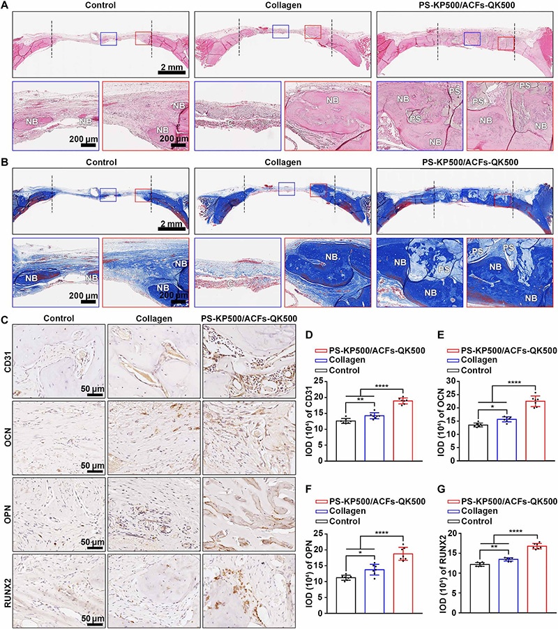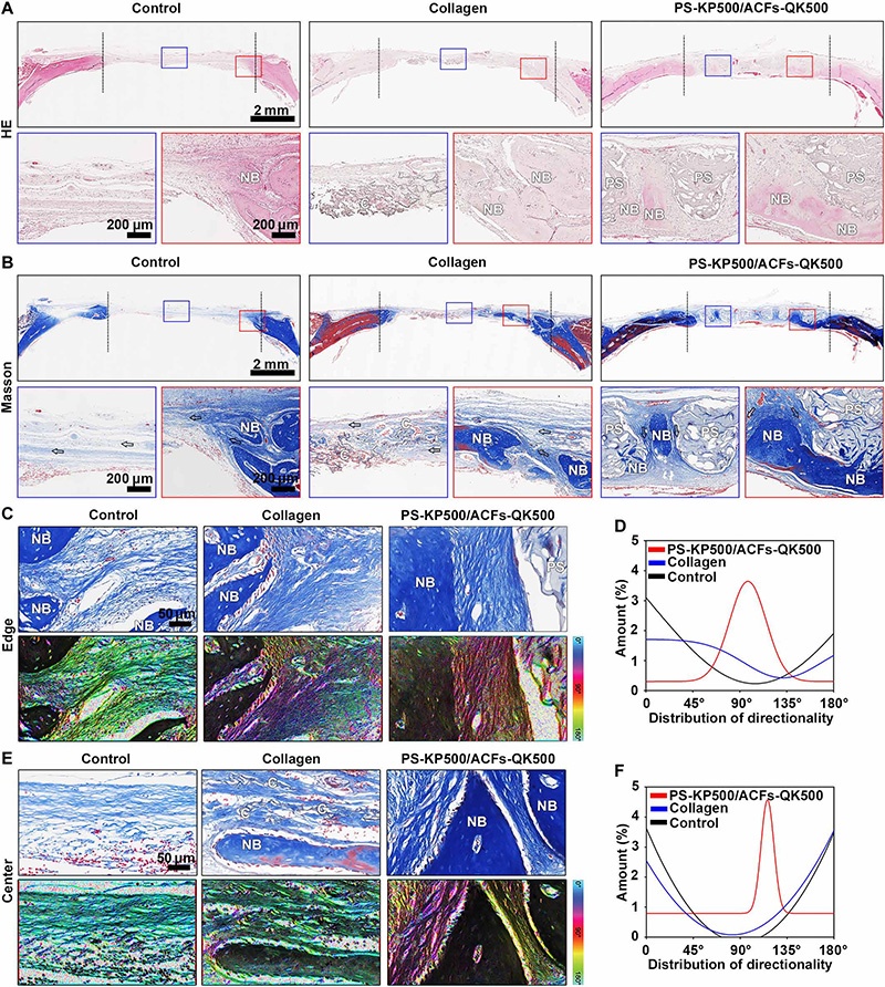 A-B:H&E与三色染色(n=5):PS-KP500/ACFs-QK500与胶原海绵组缺损区域可见更多新生骨(NB)有机基质,对照组极少;PS-KP500/ACFs-QK500组检测到垂直定向胶原纤维(由ACFs引导),且纤维内形成脱钙有机骨基质;