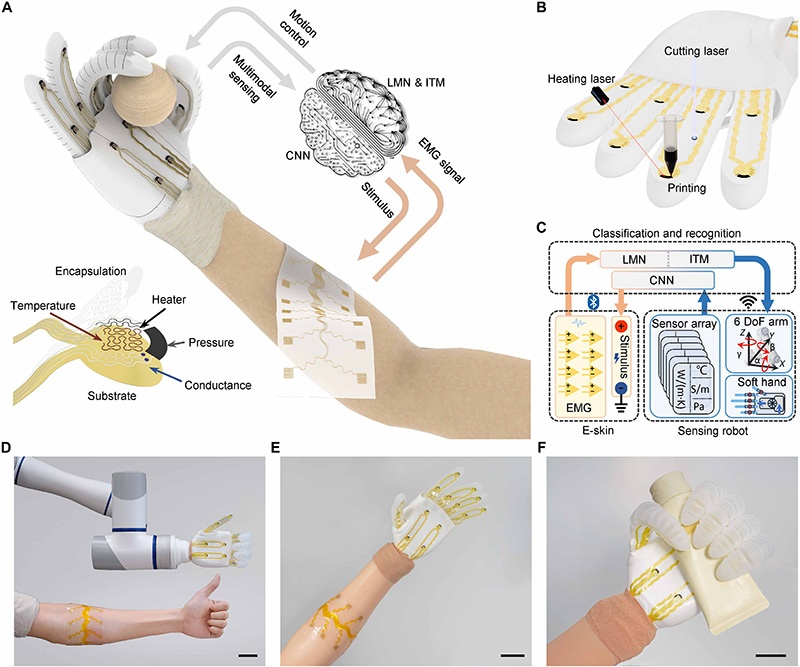 研究提出的3D打印人机界面核心架构包含三部分:用于表面肌电(sEMG)采集和刺激反馈的电子皮肤、多模态触觉感知传感软体机器人、手势分类与材料识别的机器学习算法(图1A)。