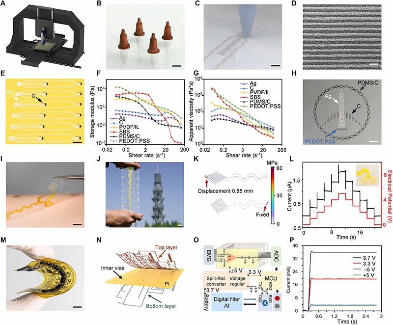 1. 核心制造技术:采用“DIW墨水直写3D打印+红外激光+切割激光”的大规模集成3D打印技术,制造多材料、高密度传感器阵列的柔性生物电子器件(图1B)。关键工艺包括: