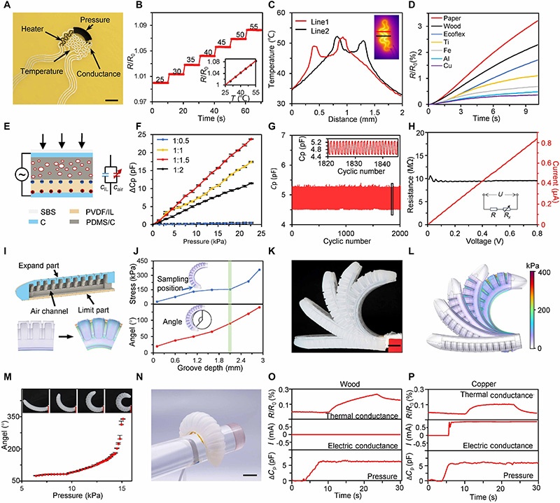 多模态传感器阵列(温度、压力、导电、加热器)通过串行印刷集成,附着于软体机器人实现物体感知(图4)。