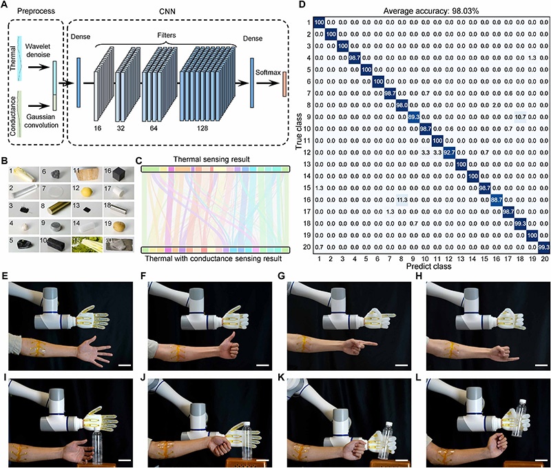 结合热导率与电导率传感,设计紧凑CNN网络实现物体识别(图5)。