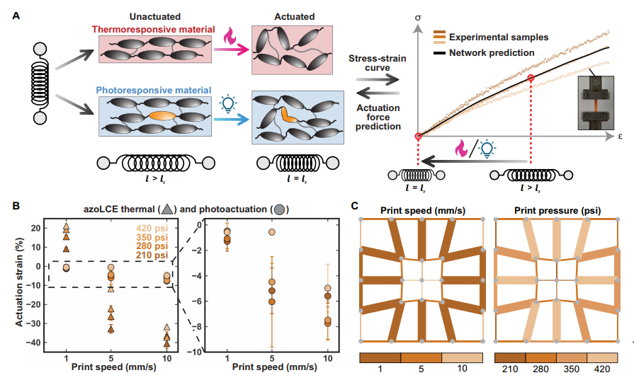 选择液晶弹性体(LCE)作为研究对象,开发了两种LCE配方:偶氮苯功能化LCE(azoLCE,响应热和紫外光)和纯LCE(neatLCE,仅响应热)。采用多材料高温直接墨水书写(HOT-DIW)3D打印技术,确定打印速度、压力和路径数为关键制造参数,通过实验表征这些参数对材料刚度和变形性能的影响,并将实验数据用于训练神经网络模型。
