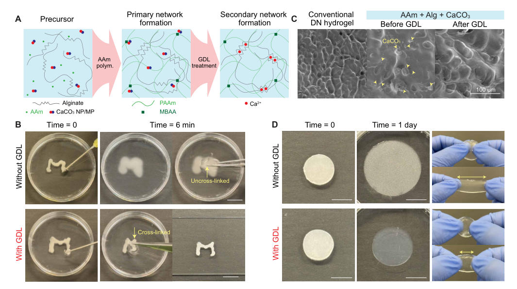本研究基于经典海藻酸盐/PAAm双网络水凝胶系统,用碳酸钙(CaCO₃)替代常用的氯化钙(CaCl₂)或硫酸钙(CaSO₄)作为钙源。CaCO₃形成纳米至微米级颗粒,在中性pH下稳定,仅在酸性条件下释放钙离子。通过将CaCO₃微粒嵌入海藻酸盐/聚丙烯酰胺双网络水凝胶,利用葡萄糖酸-δ-内酯(GDL,一种生物相容性酸化剂)按需触发钙离子释放,实现离子交联的时空调控: