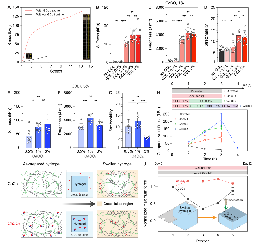 实验验证,在含GDL的浴液(pH≈5)中,CaCO₃负载的海藻酸盐溶液几分钟内即可凝胶化;而在无GDL的中性环境(pH≈7)中,溶液仅分散不交联。将CaCO₃颗粒融入海藻酸盐/PAAm水凝胶基质后,GDL处理使颗粒溶解、钙离子释放,凝胶从白色不透明变为透明,溶胀减少,刚度增加。