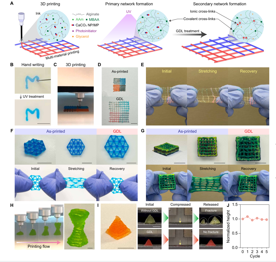 采用基于DIW的3D打印技术,将含CaCO₃、海藻酸盐、丙烯酰胺、光引发剂、交联剂和甘油(防打印时脱水)的水凝胶墨水进行打印,UV光照射形成PAAm共价网络,GDL处理触发局部钙离子释放和海藻酸盐离子交联。实验验证了墨水的可打印性、结构完整性和几何精度,成功制备了网格、三角晶格、卷曲图案、字母“M”、 auxetic设计等2D结构,以及多层晶格、花瓶、金字塔等3D复杂结构。GDL处理后的结构力学稳健、可拉伸,循环压缩下保持形状和完整性。