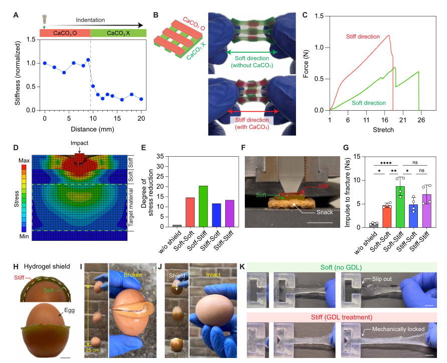 通过制备含CaCO₃和不含CaCO₃的相邻区域复合水凝胶,实现了空间选择性交联和力学异质性编程。正交图案化的水凝胶结构表现出显著各向异性:沿柔性轴易拉伸,沿刚性轴抗伸长。有限元模拟和实验验证,软-硬双层结构的水凝胶屏蔽层能有效分散冲击应力,显著提升脆性材料(零食)的断裂抗性,成功保护生鸡蛋从25cm高度跌落不破裂。此外,GDL处理的水凝胶在界面机械锁定中表现出优异的抗滑移性能。