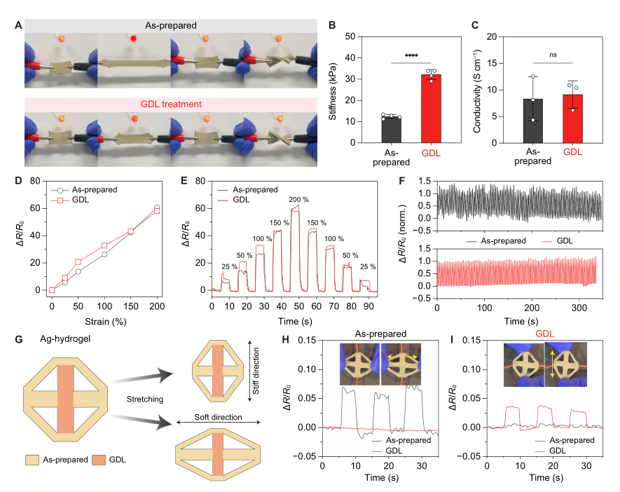 将银颗粒融入水凝胶基质制备导电复合材料,GDL处理后水凝胶刚度和韧性显著提升,但导电性未受影响。应变传感测试表明,制备态和GDL处理的水凝胶在200%应变内表现出相当的灵敏度和线性度,循环加载下耐久性优异。通过空间图案化柔性和刚性区域,实现了定向传感功能:沿柔性轴拉伸时电阻变化大,沿刚性轴拉伸时电阻变化小,正交加载下信号最小。