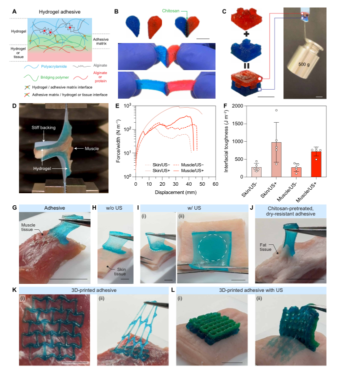 利用壳聚糖作为桥接聚合物,水凝胶实现了水凝胶-水凝胶的强粘合,3D打印结构可集成并支撑500g重量无分层。水凝胶与皮肤、肌肉等生物组织的粘合界面韧性约为300 J/m²,超声处理可使粘合强度提升约3倍,并实现空间可控粘合。壳聚糖预处理并干燥的水凝胶,经界面水再水化后仍能实现稳健粘合。3D打印的2D晶格和3D层状结构可与复杂组织几何共形附着,展现出先进形状可编程生物粘合剂的潜力。