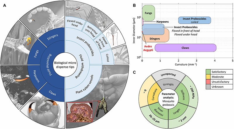 自然界中存在多种具有复杂结构和优异性能的微型分配尖端,如昆虫口器和植物木质部导管。雌性蚊子口器具有坚硬、近乎笔直的结构,配备振动辅助机制,能够以最小的力刺穿表面并精确进入血管,其独特的机械、几何和结构特性使其成为分配应用的理想候选材料。
