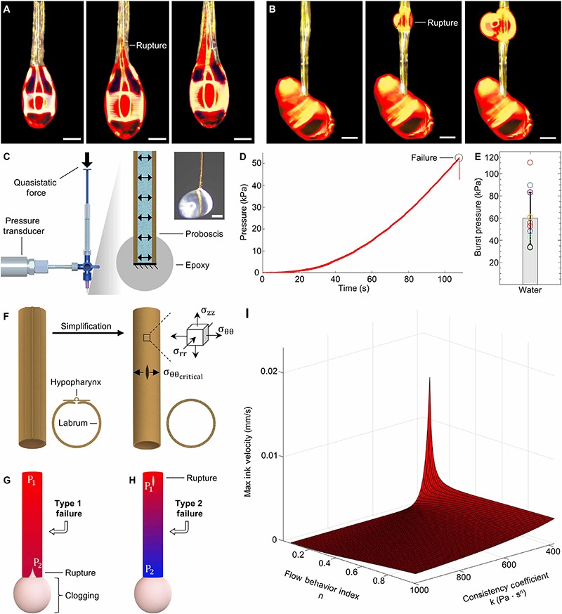 研究人员构建了定制化的爆破压力测量装置,通过缓慢移动注射器 plunger 创造准静态压力,直到蚊子口器失效。多次爆破压力测试得出平均爆破压力为59.7kPa。